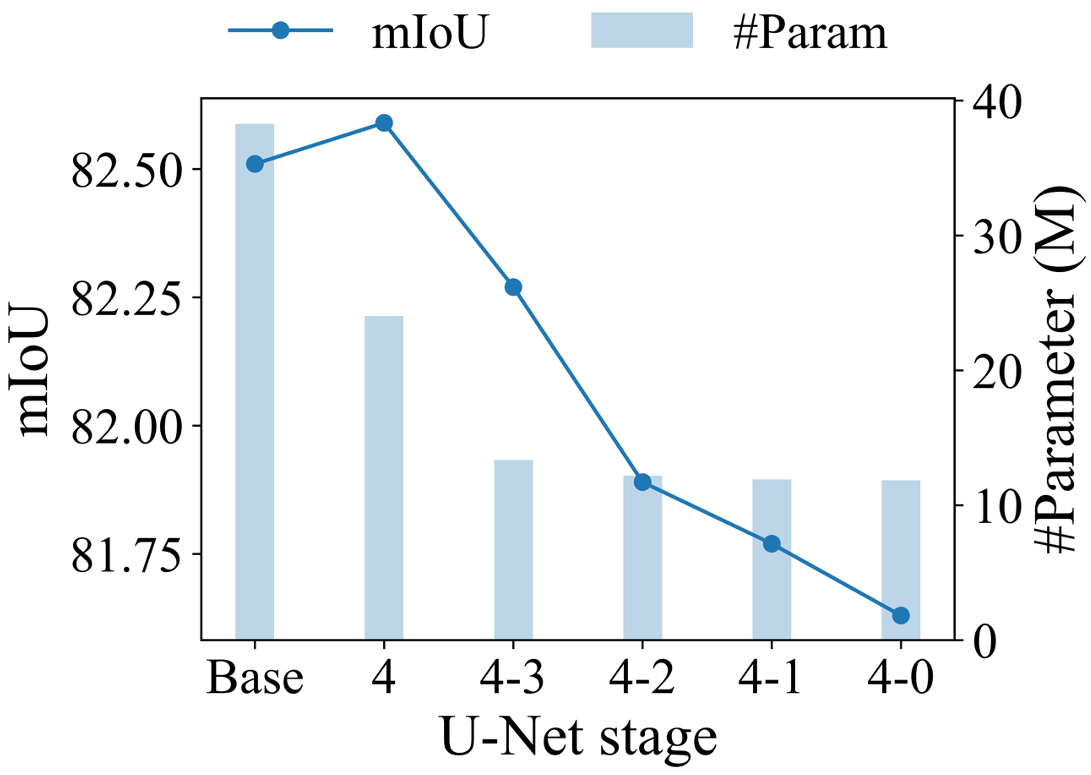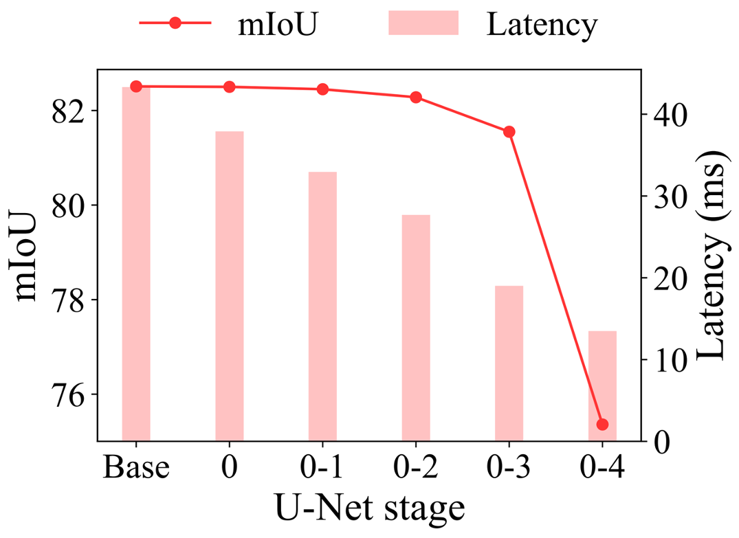As shown in the figure below (left), removing attention in early stages boosts efficiency with almost no drop in mIoU, whereas removing attention in later stages harms performance. On the other hand, the right figure shows that removing convolution in later stages greatly reduces the parameter count with a negligible change in mIoU, whereas removing convolution in early stages only marginally improves efficiency but adversely affects performance.
