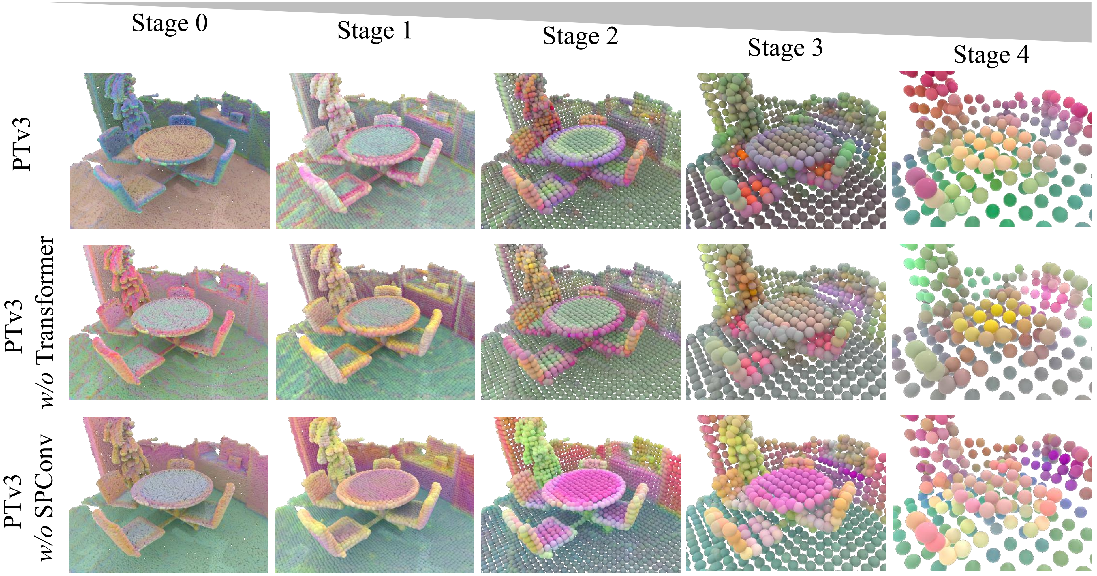 Early stages operate on point sets with high spatial resolution and density, where local geometric reasoning is critical. Employing convolution layers in these stages efficiently aggregates information over local receptive fields, with minimal parameter overhead. As one progresses to deeper stages, the number of point tokens is greatly reduced and semantic abstraction becomes more important, hence one switches to attention-based blocks.