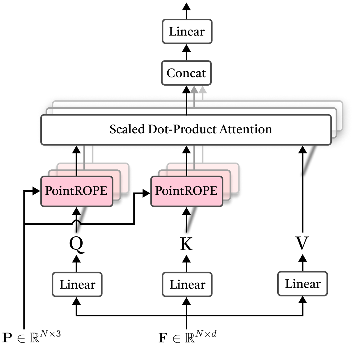 In the Point-ROPE attention module, input point features are projected to query (Q), key (K), and value (V) representations. PointROPE is then applied to Q and K, leaving V unchanged. The resulting "rotated" $\text{Q}'$ and $\text{K}'$ are fed into a standard scaled dot-product multi-head attention together with V, followed by a linear projection that produces the final output embeddings. Our PointROPE implementation is compatible with FlashAttention.