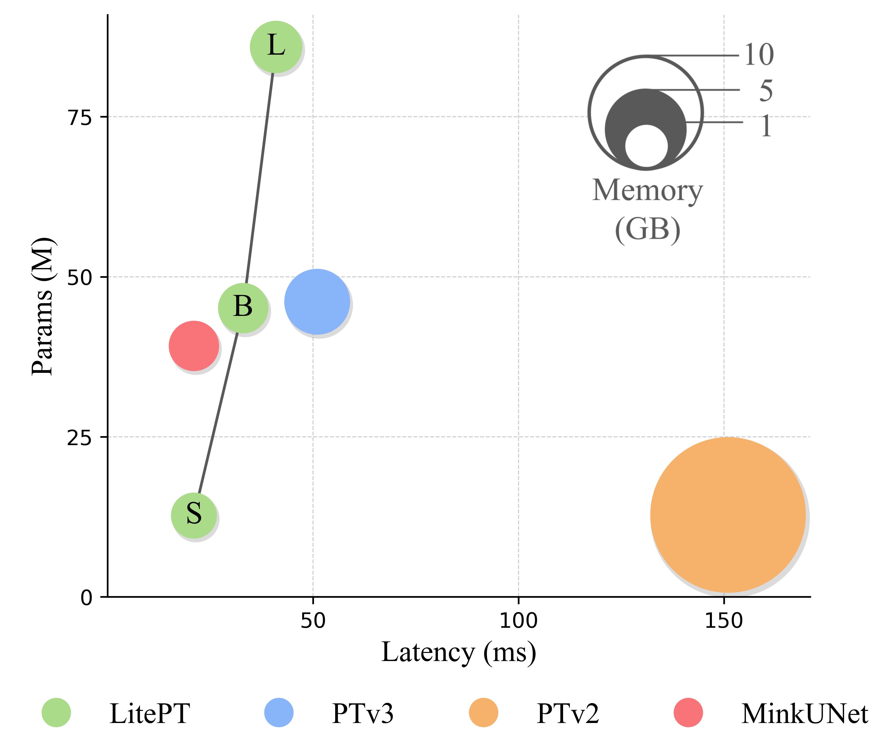 LitePT-S has $3.6\times$ fewer parameters, $2\times$ faster runtime and $2\times$ lower memory footprint than PTv3. It remains faster and more memory-efficient than PTv3 even when scaled up to 86M parameters (LitePT-L).